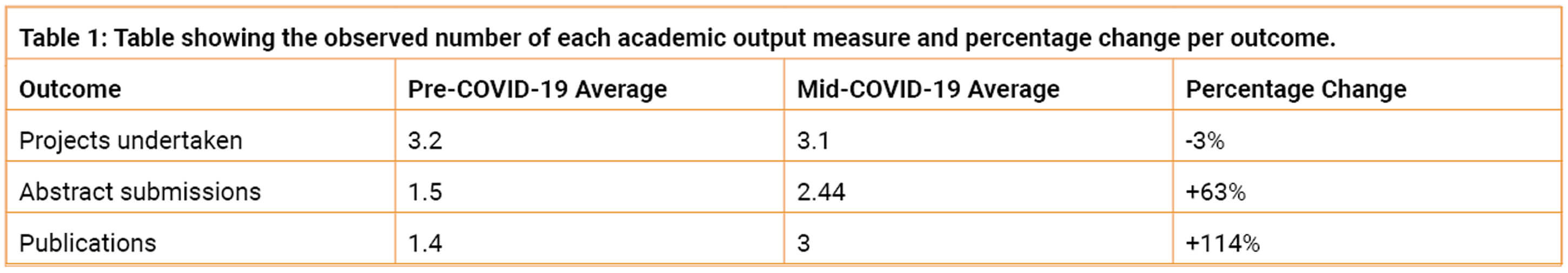 Mid-pandemic, an average of three publications were achieved compared with 1.4 pre-pandemic. Seventy-eight percent submitted abstracts during both periods, increasing from 1.5 to 2.44 mid-pandemic. Although the average number of projects undertaken pre- and mid-pandemic was 3.2 and 3.1 respectively, the number of trainees undertaking projects increased by 22% to 100% (Figure 1).