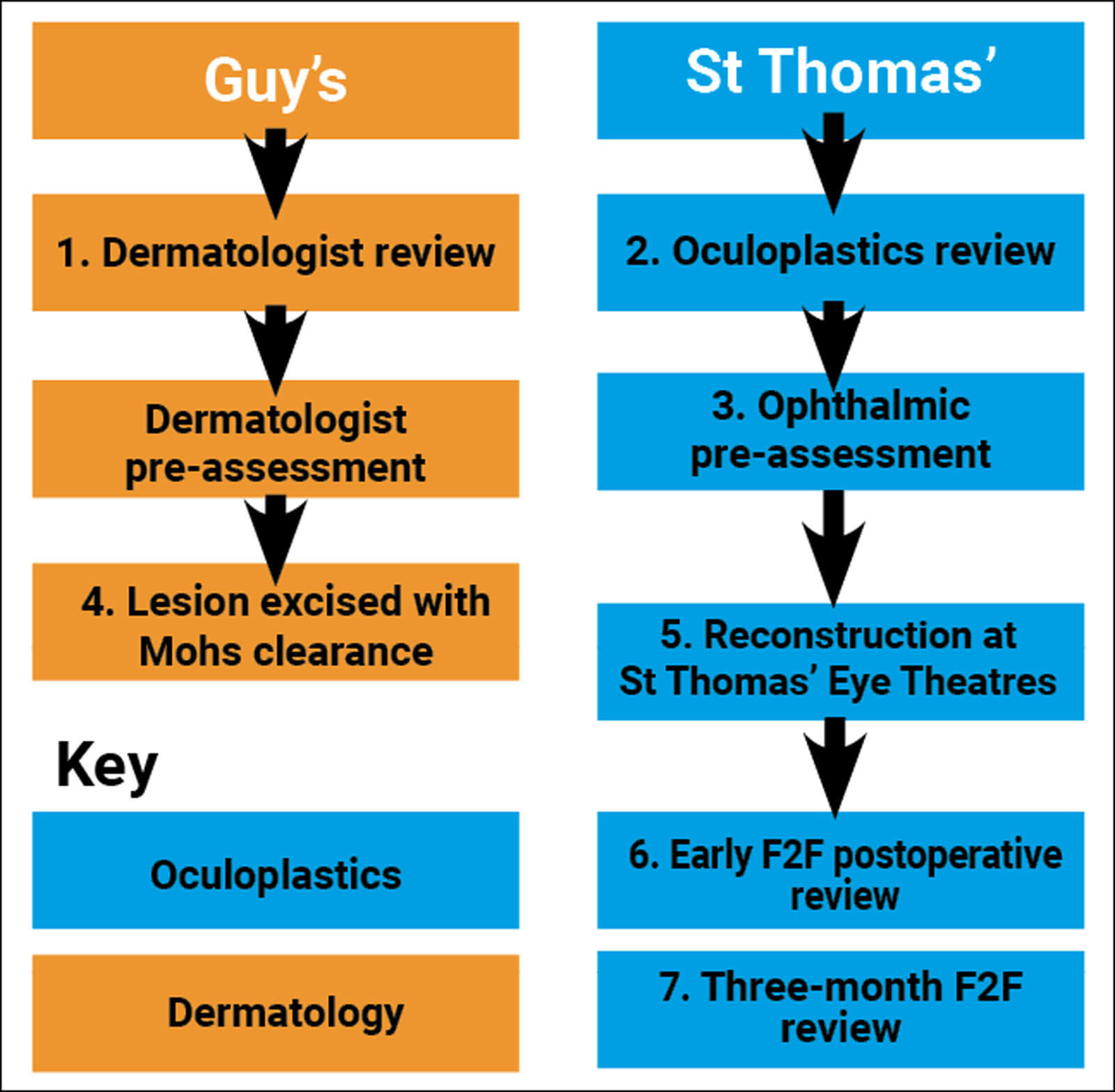 As well as the obvious benefit of patients being able to have their periocular reconstructions completed in a timely fashion during the COVID-19 pandemic, many other benefits of this new pathway soon emerged, resulting in its ongoing and increasing use. Most obvious was the reduced number of hospital visits required for the patient. Not only did patients combine their two surgical visits into one, but being under one centre rather than two obviated the need for separate pre-assessments. With time, the consultation and postoperative review system was also streamlined so that oculoplastic input became available within the DSLU at the time of initial consultation, and all first postoperative checks were undertaken by the oculoplastic surgeon at DSLU too. Three-month postoperative check-ups were moved to a telephone review, with any patients having functional or aesthetic concerns being able to return for a face-to-face (F2F) assessment. Unusually complex new referrals requiring an additional, more detailed ophthalmic examination would be booked for that within the eye department and the rare cases that required systemic oncological management were plugged into the non-melanoma skin cancer medical decision making (MDM). The new IPU and old two-site pathways are illustrated in Figures 1 and 2.