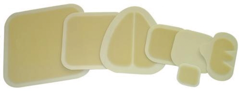 Hydrocolloids (Figure 2) are complex dressings containing polymers held in suspension plus gel-forming agents (methylcellulose, pectin, gelatin, polyisobutylene) and adhesives. They come as pads, sheets, or filler forms (e.g. paste) for occlusive use. They slowly absorb wound fluids, changing their physical state to become a covering, soft gel that sits on the wound. They are impermeable to gases and liquids.