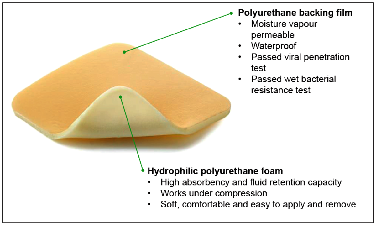 Foam dressings (Figure 3) are usually made of non-adhering polyurethane, which is hydrophilic, and an occlusive cover. Foam dressings can be silicone based too. The polyurethane is highly absorptive and acts as a wick for wound fluids, making them useful for highly exudative wounds (Figure 1).