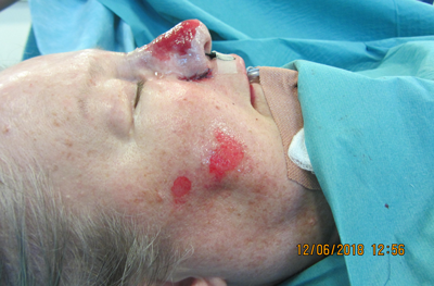 Figure 7a & b: Pre and postoperative view of a series of basal cell papillomas, easily wiped off the skin in a clean cleavage plane at the dermal-epidermal junction after superficial single pass ‘paintbrush’ treatment with Nebulaskin. There is a very superficial dermal injury and healing occurs within one week.