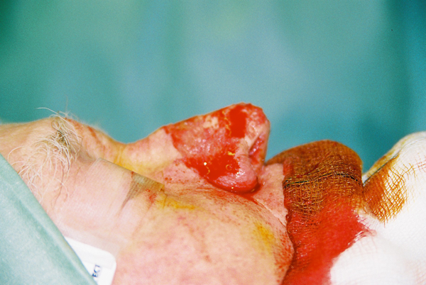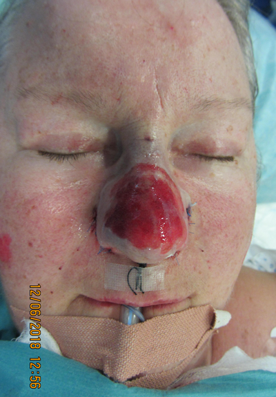 Plasma has now been used successfully to treat three patients with moderate and distressing rhinophyma (Figures 2a & b and 3a & b). Investigations on the depth of dermal injury created by plasma had been studied previously [2]. Under general anaesthetic the rhinophyma skin was prepared using aqueous chlorhexidine and treated with as many passes of continuous focused plasma energy as was necessary to cause a mid-dermal injury. In these cases two passes were adequate. It would have been perfectly reasonable to treat these rhinophyma cases under local anaesthetic if the rhinophyma had been in isolation, but these patients were having combined surgical procedures. The sloughy resultant superficial eschar was wiped using a dry swab with lateral friction to reveal a fixed stain, red base indicating a clean intradermal injury (Figure 6).