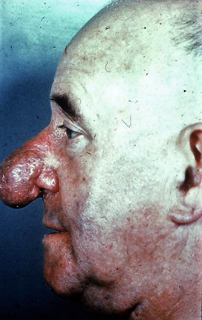 Rhinophyma is an aesthetic embarrassment to many people. It is the result of sebaceous gland hyperplasia within the skin over the alar cartilages of the nose. It has a familial tendency and in addition to being unsightly it can commonly cause problems with infection and pustular greasy secretions.