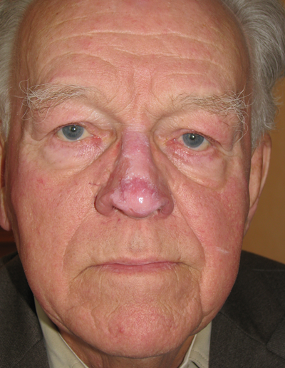 Figure 5a & b: Pre and postoperative frontal view six weeks later of the same patient with severe pustular and nodular rhinophyma shown in Figure 4a. Depigmentation and fragile skin are apparent at this stage but the contour has significantly improved.