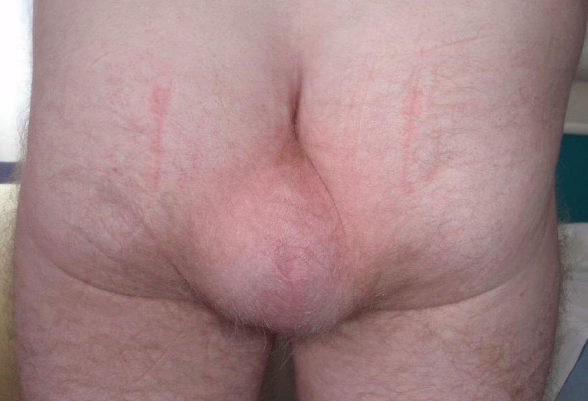 Figure 1: The patient standing, preoperatively, with the perineal hernia evident.