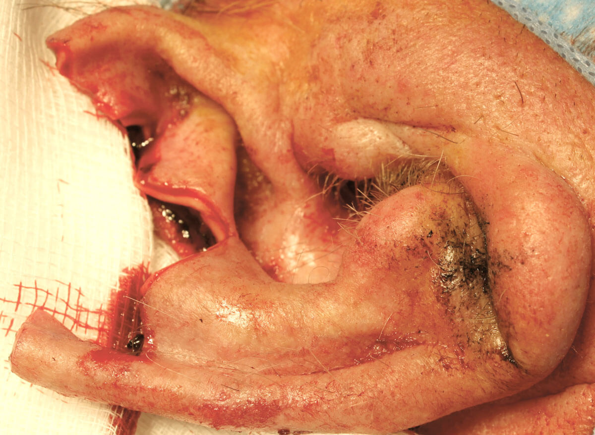 The skin is cleaned with 7.5% providone-iodine and skin infiltrated with three to four vials of Lignospan special (lidocaine hydrochloride 2% with 1:80,000 adrenaline). A full pinna block is rarely required. An aperture drape is suitable, as tissue is not being mobilised into the wound from a separate region. A number 15 scalpel blade is used to remove the lesion and margins, with a 3-0 silk marking suture placed at the 12 o’clock position to allow histopathological orientation. A fresh scalpel blade is used to excise the star-shaped pattern from the auricle to avoid cartilage spicules forming that interfere with wound closure.