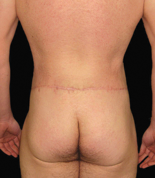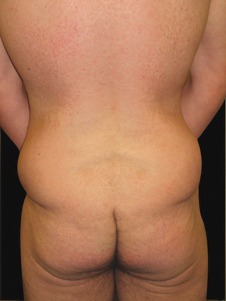 Figure 7 (pre and postoperative): A body lift involves the removal of tissue all the way around the body. It is truly the only way to address the excess tissue around the flanks and buttocks following weight loss surgery. Although a more extensive procedure for patients presenting in this manner, a body lift is the best rejuvenating technique.