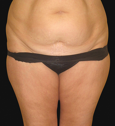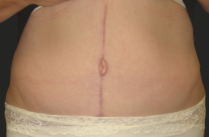 Figure 6 (pre and postoperative): This lady had extensive fat in the upper abdomen and a previous incision in the midline. In this scenario a fleur de lis abdominoplasty can help address this upper fullness and improve the abdominal contour. This is a picture taken after three months and the vertical scar will continue to fade over time. Occasionally this may be required following weight loss surgery.
