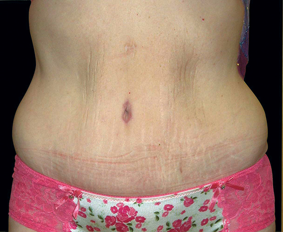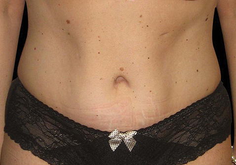 Figure 5 (pre and postoperative): This lady has previously had laparoscopic weight loss surgery. The tummy button has been relocated in one of the previous scars following laparoscopy and the excess tissue has been removed. This has resulted in improved definition of the abdomen.