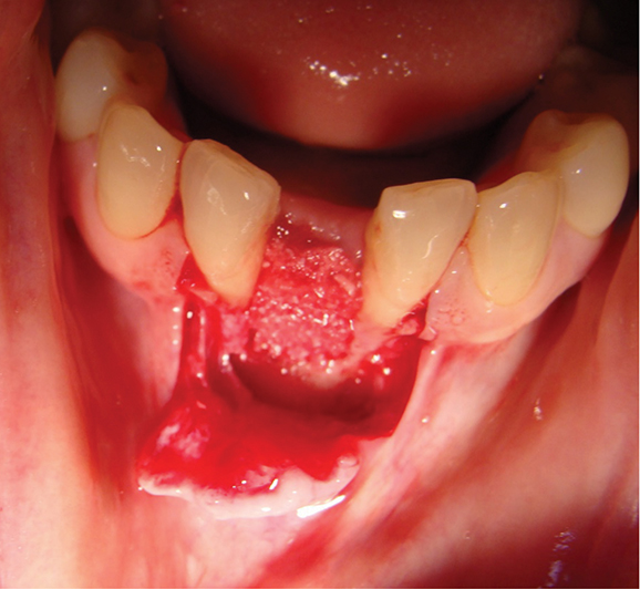 Above: Guided bone regeneration using a particulate anorganic bovine graft in the lower incisor area.