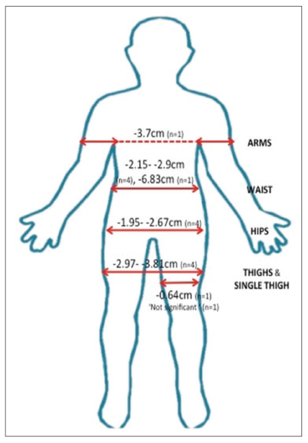 It is possible that duration and frequency of treatments, and course length, do not significantly impact on the overall results. The study with the highest frequency and longest individual treatment time, Jackson et al. in 2012 [16], delivered 40-minute sessions three times weekly for two weeks to 689 patients, resulting in waist -2.9cm, hip -2.41cm, thighs -3cm, and -0.81cm for each arm. However, with the same frequency and course length, but treatment time of 20 minutes, Jackson et al. in 2009 [12] also produced significant results at the waist -2.49cm, hip -2.67cm and thighs -3.81cm, and with 30-minute sessions twice weekly for four weeks Caruso et al. [5] also produced significant reductions at the waist of -2.15cm.