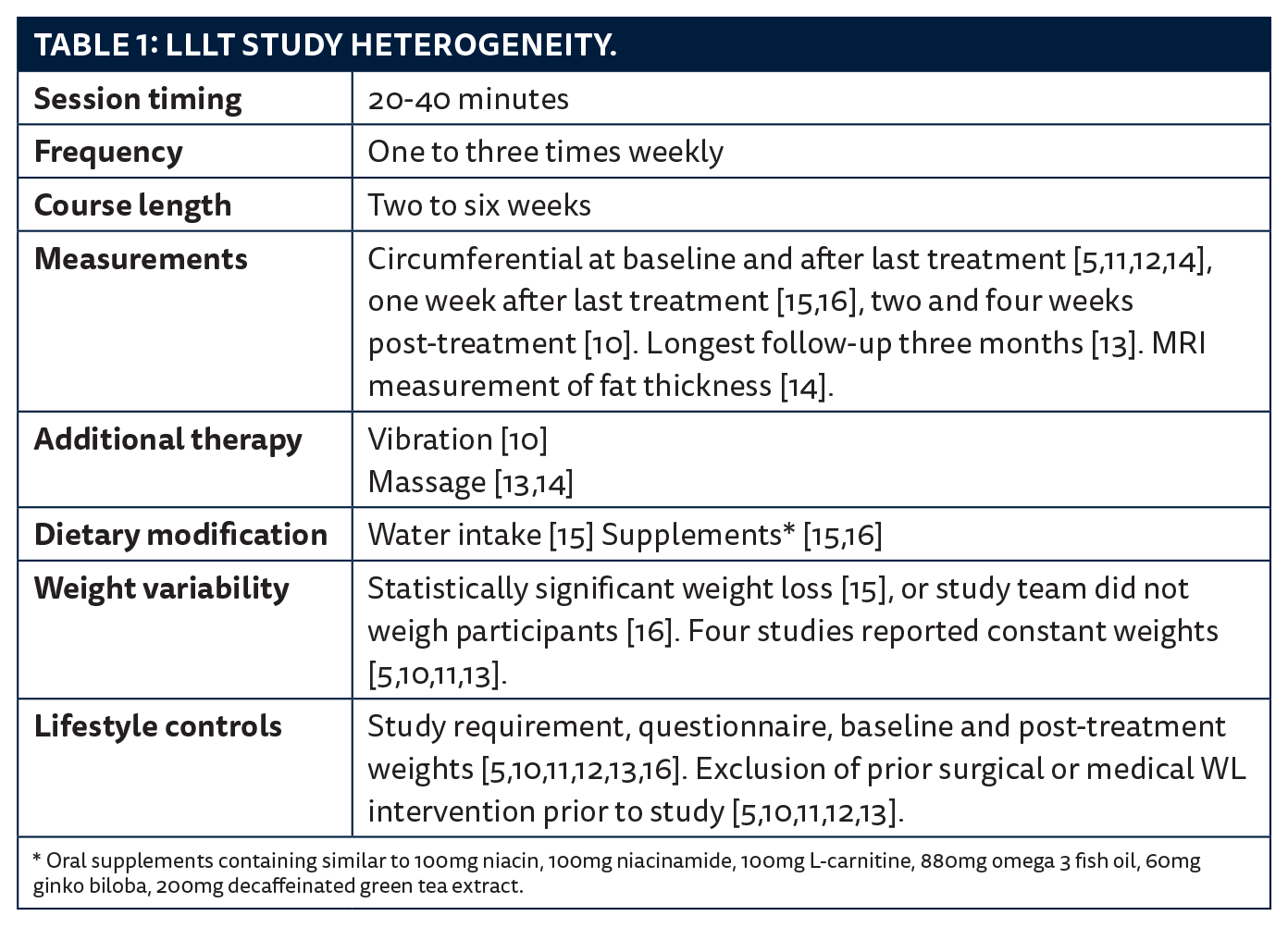 Health supplements such as niacin, niacinamide, L-carnitine, omega 3 fish oil, ginko biloba, decaffeinated green tea extract [15,16] are intended to stimulate fat metabolism, though their impact is not well known. The use of additional physical therapies may enhance efficacy and have health benefits, such as vibration therapy, which is thought to promote metabolism of lipid by stimulating skeletal muscle and vascular and lymphatic drainage [10]. Due to heterogeneity it is uncertain whether the combination of LLLT and vibration in Savoia et al. [10] explains their superior circumferential results, but complementing LLLT with additional treatment and / or encouragement to promote metabolism seems healthier for the patient and may produce the best and most sustainable results.