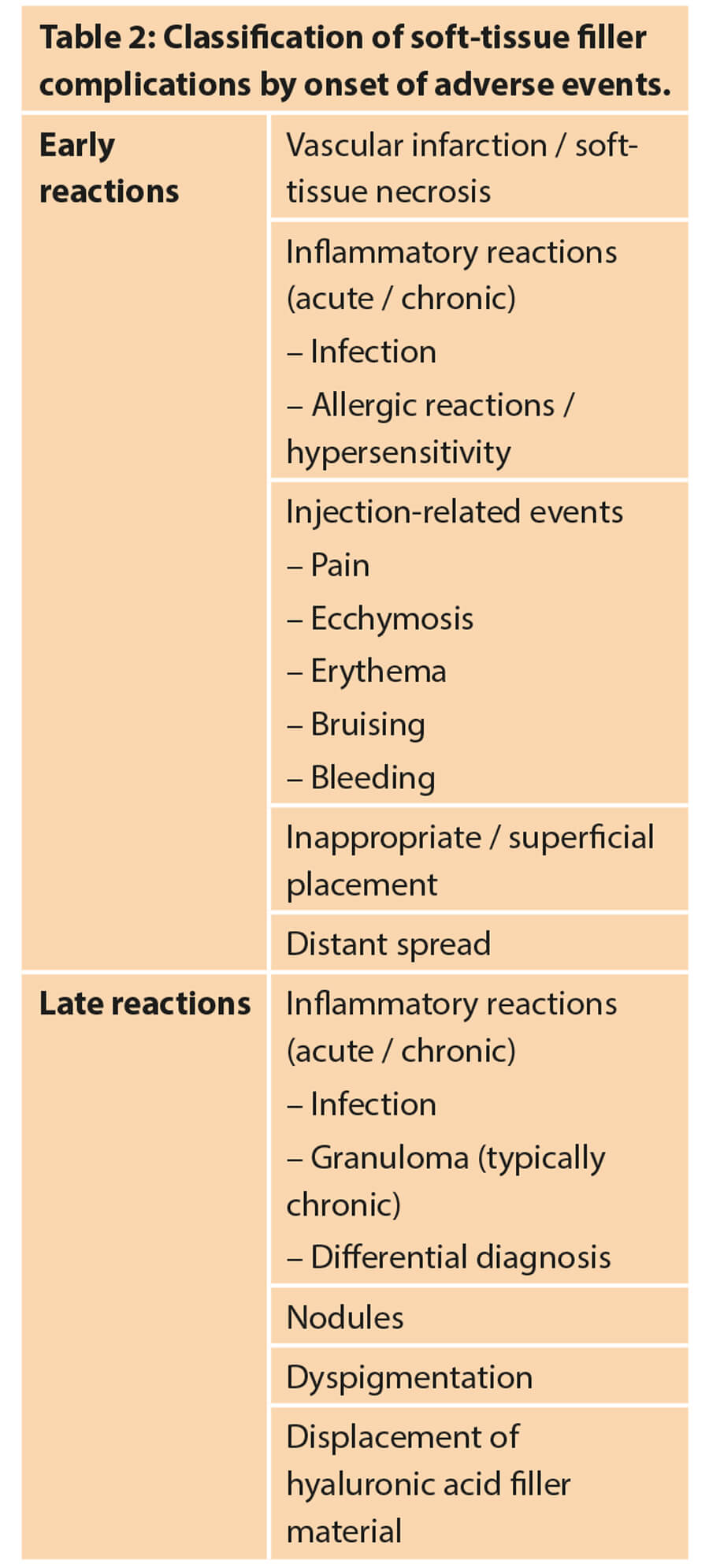 Importantly they distinguished complications into early and late reactions. These are seen in Table 2. This helps the practitioner be aware of which signs and symptoms to look out for during and immediately after the treatment.