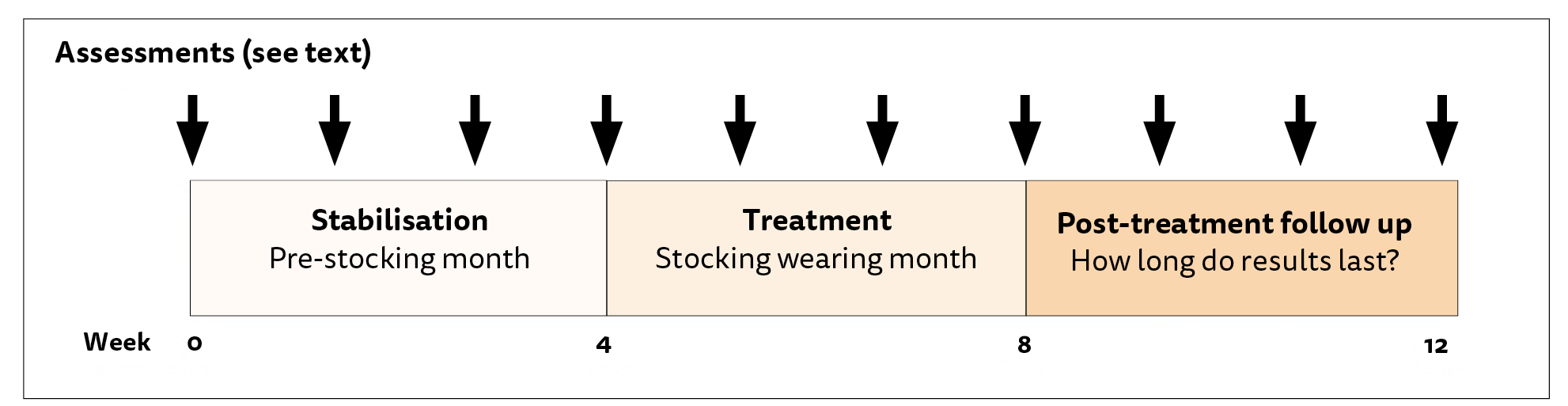 The format of the study was a 12-week prospective period split into three periods of four weeks each. The first period (weeks 1-4) was the stabilisation period, second period (weeks 5-8) was the treatment period or ‘stocking-wearing month’ and the final period of the study (weeks 9-12) was the post treatment follow-up month, to establish how long any visible results might last (Figure 1).