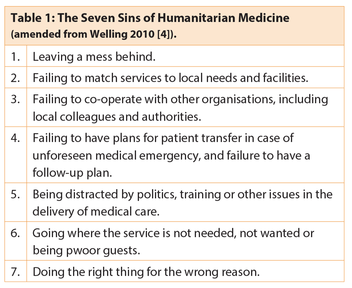 There are multiple definitions of ‘success’ and ‘failure’ depending on the criteria, and the perspective of the assessor - be it organisation or individual. In 2010 Welling grouped the major reasons for failure at an organisational level in humanitarian medicine under the banner ‘The Seven Sins’ (Table 1) [4]. On the whole these represent the ‘lingering bad taste’ that a well-intended team can leave with the host, representing a mis-alignment between the two.