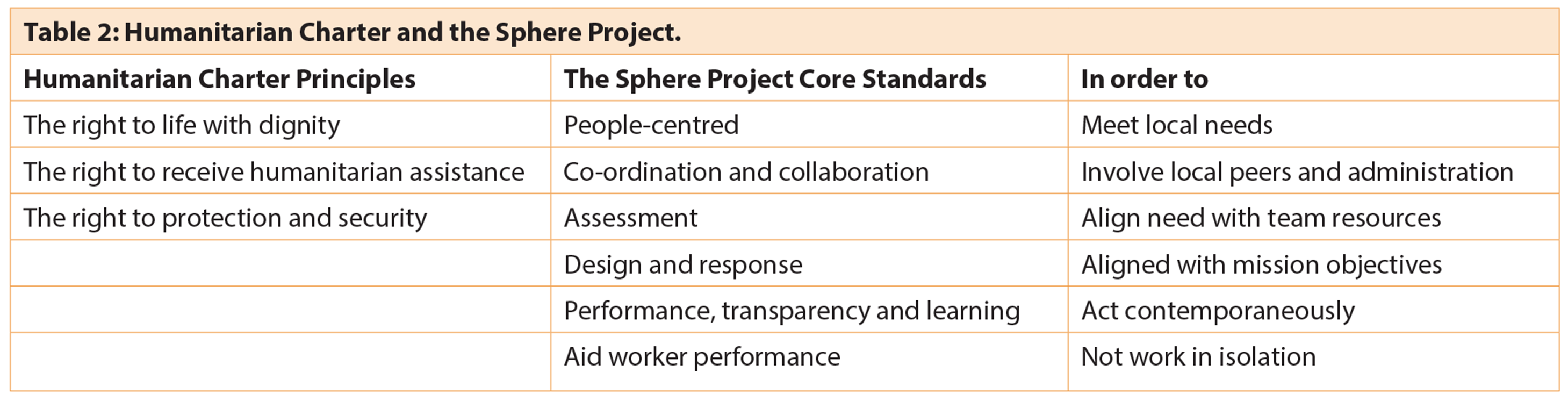 In 1997 a group of humanitarian non-governmental organisations (NGOs) and the International Red Cross and Red Crescent Movement initiated the Sphere Project [4], with the aim of improving the quality of their actions during disaster response and to be held accountable for them. Although formulated around disaster or conflict the resultant Humanitarian Charter and Core Standards are based in international law and include process standards that are applicable to the delivery of all medical aid, at the heart of which is the inclusion of the affected population, and processes to enhance quality and accountability (Table 2).