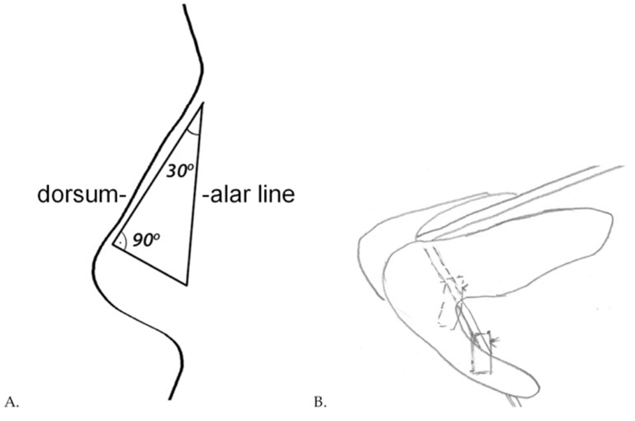 Figure 3: A. A 30 degree dorso-alar angle is responsible for best tip position and projection. B. For columella sliding, two to three mattress transmucosal sutures are passed from columella caudal surface to a higher point of caudal septum to give projection to the tip. Vice versa, the columella is sutured to lower points of the septum to lower the projection of the tip if projection is unaesthetically high.