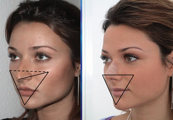 The nasal tip should be at the level of the cheekbones to make visible the beauty triangle.