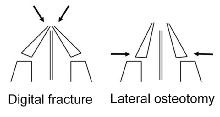 The purpose of digital fracture versus lateral osteotomies is to narrow the bony base of the nose after the dorsal correction, by closing the open dorsal roof, avoiding the lateral ‘rocker’ or step-like deformities.