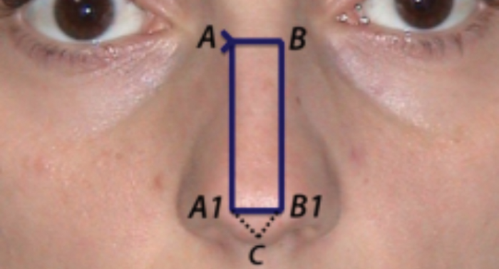 Figure 5: This transcutaneous suture represents a circle around the projected large greater alar cartilages, including both domes. It is performed using two important transcartilagenous transdomal needle passes: A-B and A1-B1 and two subdermal needle passes: A-A1 and B-B1. Pass A-B can also fix the medial crura of the greater alar cartilages to lift the drooping columella simultaneously.