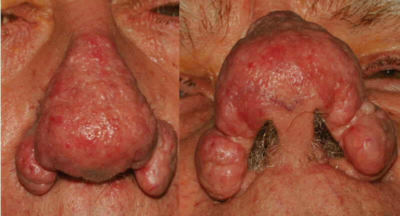 Rhinophyma, a severe form of chronic rosacea, is a benign proliferative disorder of the nose almost exclusively affecting Caucasian men [1]. Although its pathogenesis is still not completely understood, clinical manifestations include erythema and enlargement of the nose with tumour-like growths due to sebaceous and connective tissue hypertrophy [1].