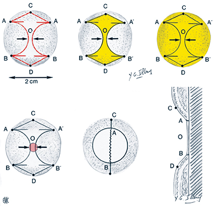 Figure 3: Illouz neo umbilicoplasty: two semicircular flaps are inverted and fixed to the deep plane. The design looks like the Chanel logo and Illouz called it ‘the Chanel umbilicus’. Illouz mathematic rules: the pubic triangle must be an isosceles triangle of 10cm, and the umbilicus must be in the middle of the xyphoid pubic line distance less 10%: minimum 10cm and maximum 13cm.