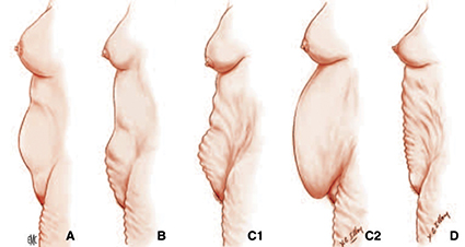 Figure 1: The different possibilities: A: Fatty lower abdomen: suction only. B: Fatty abdomen with defects in the infraumbilical area: suction + bikini abdominoplasty. C1: Skin defects on supra and infraumbilical areas: suction + classical abdominoplasty. C2: Pendulum abdomen: suction + Illouz bloc abdominoplasty with immediate neo umbilicoplasty. D: No fat but only skin excess: no suction, only abdominoplasty.