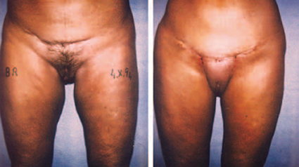 For the inner thighs deformity, the author described a new technique to avoid any recurrence, and the opening of the vulva by doing vertical scars fixed to the Colles ligament with a scar entirely hidden in the pubic hair allowing the string (the ‘Illouz string technique’) (Figure 5). When excess of skin is too important and needs a dermolipectomy, the author has designed a new rotation flap which can correct deformities of external and inner thighs at the same time (Figure 6 and 7).