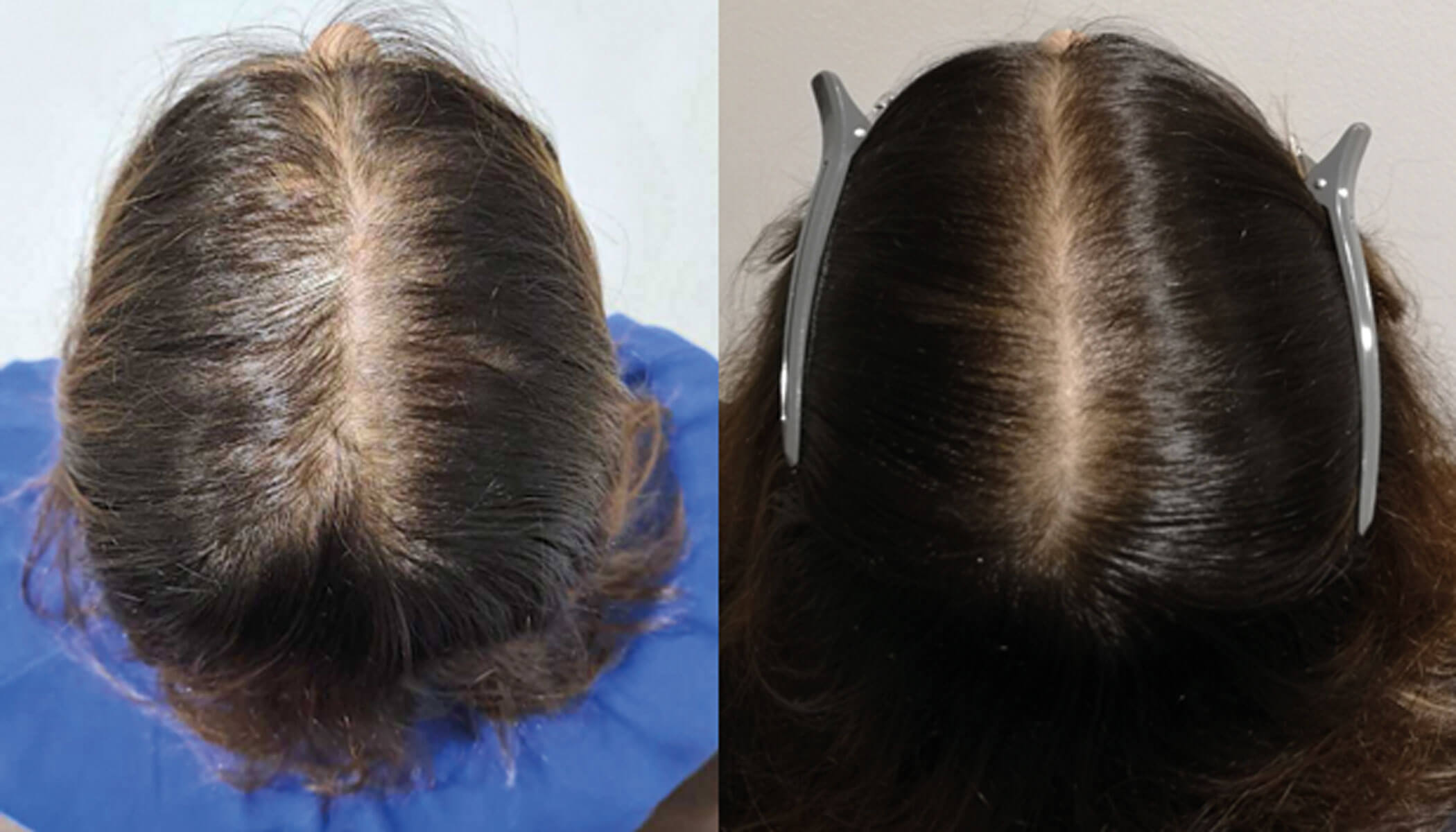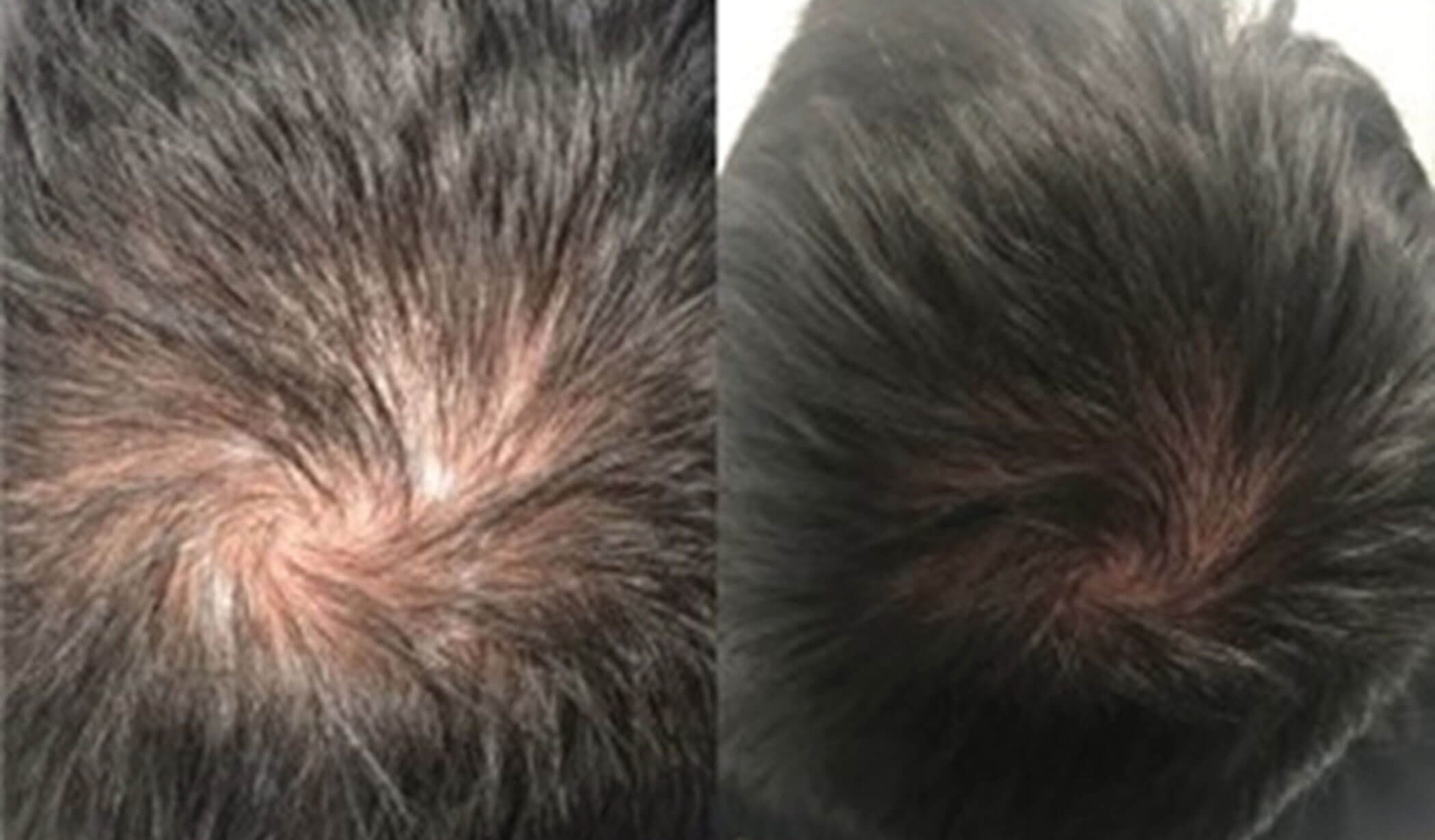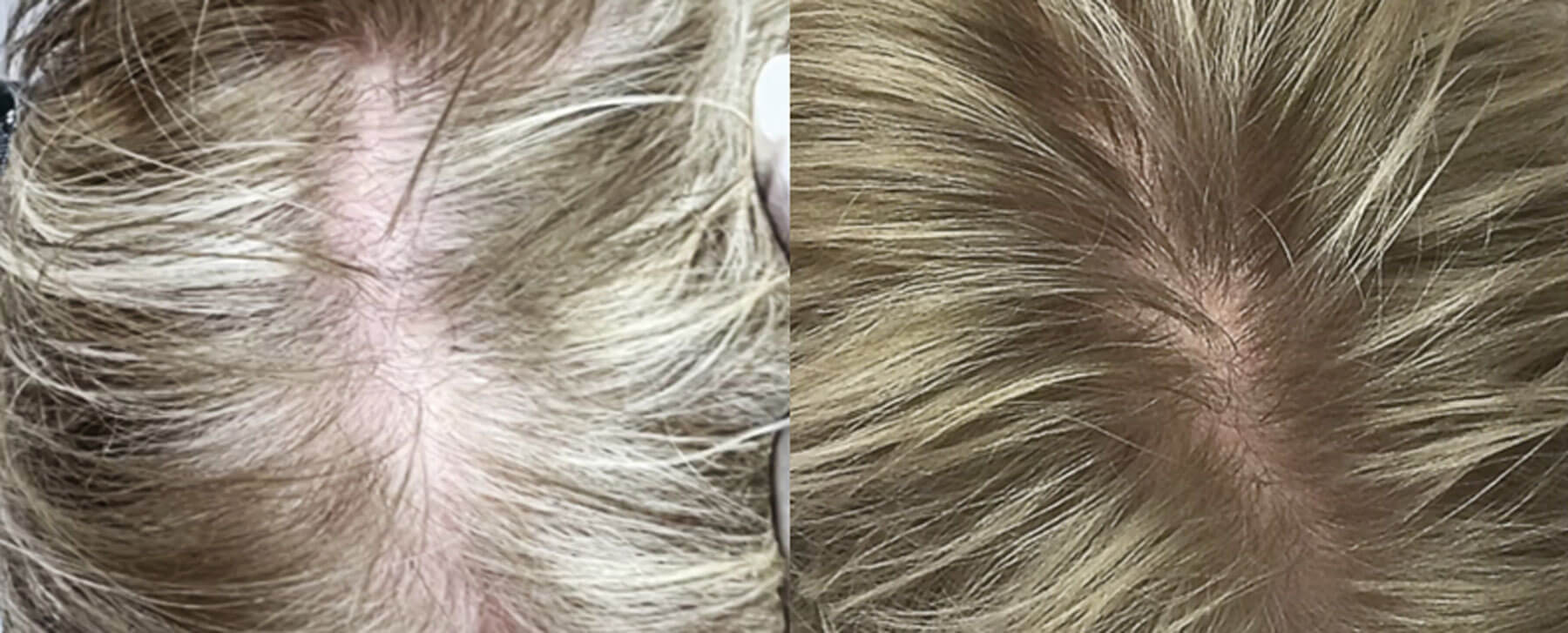 A London-based trichologist treated male and female androgenetic alopecia with weekly applications of red deer UCL-MSC exosomal proteins following microneedling. She found hair regrowth and improvements in hair density and calibre up to six months after treatment. Notably she also observed re-pigmentation in areas of greying. Similar results were observed using similar treatment protocols in Singapore and Australia [13] (Figure 4).