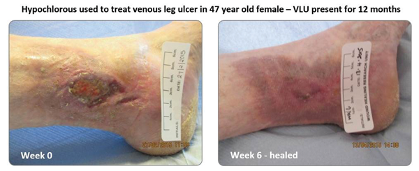 13. Selkon JB, Cherry GW, Wilson JM, Hughes MA. Evaluation of hypochlorous acid washes in the treatment of chronic venous leg ulcers. J Wound Care 2006;15(1):33-7.