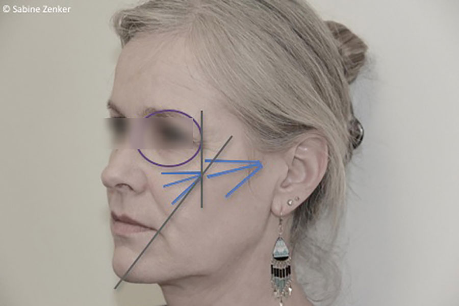 The blunt cannula length selected depends on the anatomical parameters (typically from 1½ to 2 inches) with a variety of gauges dependent on the filler (22-27G). The entrypoint is the ZAE. The linear threading technique will be used in a fan-shaped way, covering the whole area of volume depletion by managing the injection from this one entrypoint only.
