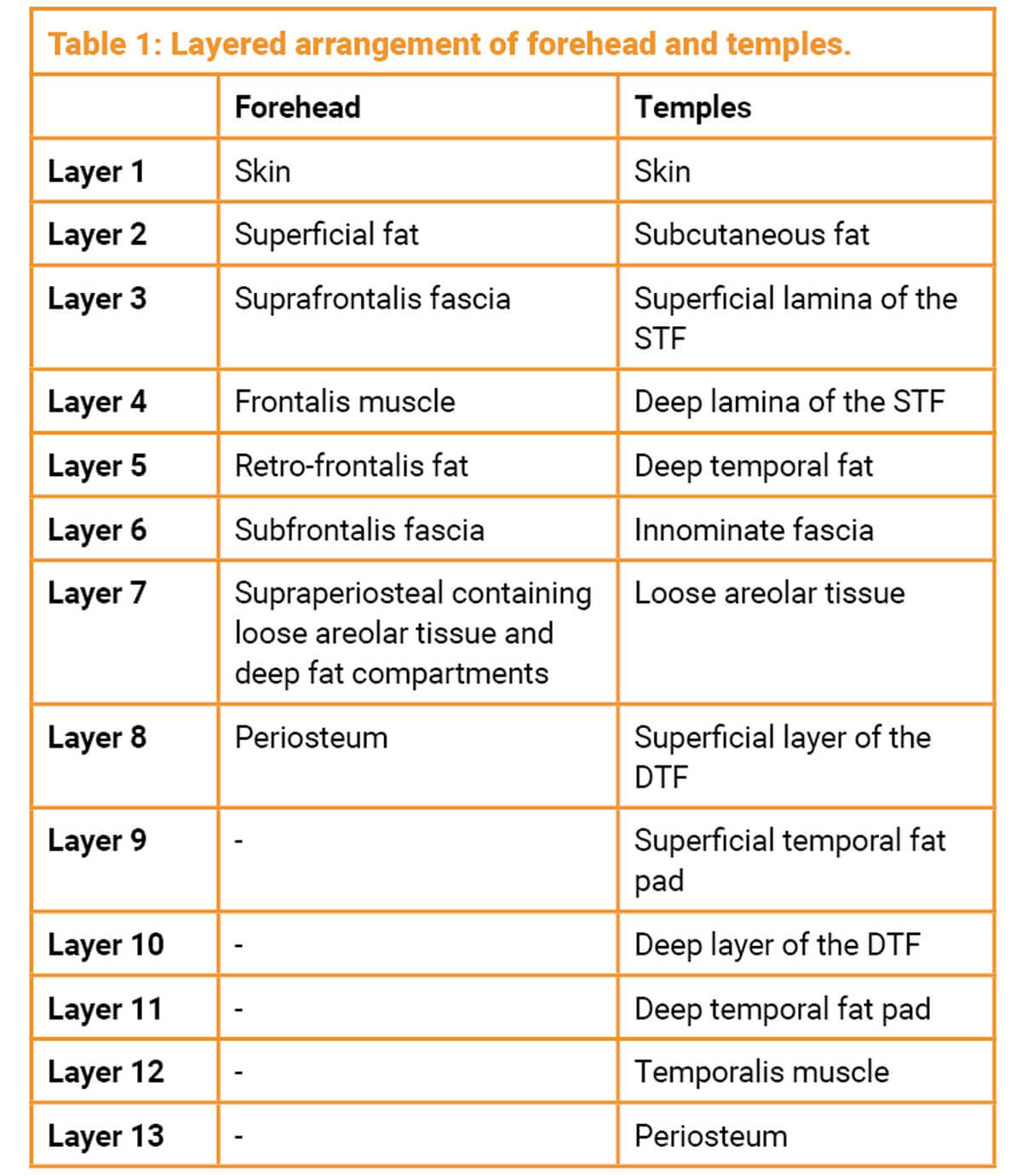 A recent study re-evaluated the anatomy of the forehead using cadaveric dissections and ultrasound imaging of live subjects, revealing a novel concept by identifying additional layers (suprafrontalis fascia, retrofrontalis fat and subfrontalis fascia) to the already recognised layered arrangement. Additionally, reinforcing the deep fat compartments or supraperiosteal plane as the preferable location for dermal filler injections to address loss of volume and contour, as nerves and arteries travel deep to the frontalis muscle but superficial to the subfrontalis fascia [4]. The temple, also referred to as the temporal fossa, has a more intricate anatomical arrangement compared to other facial areas.