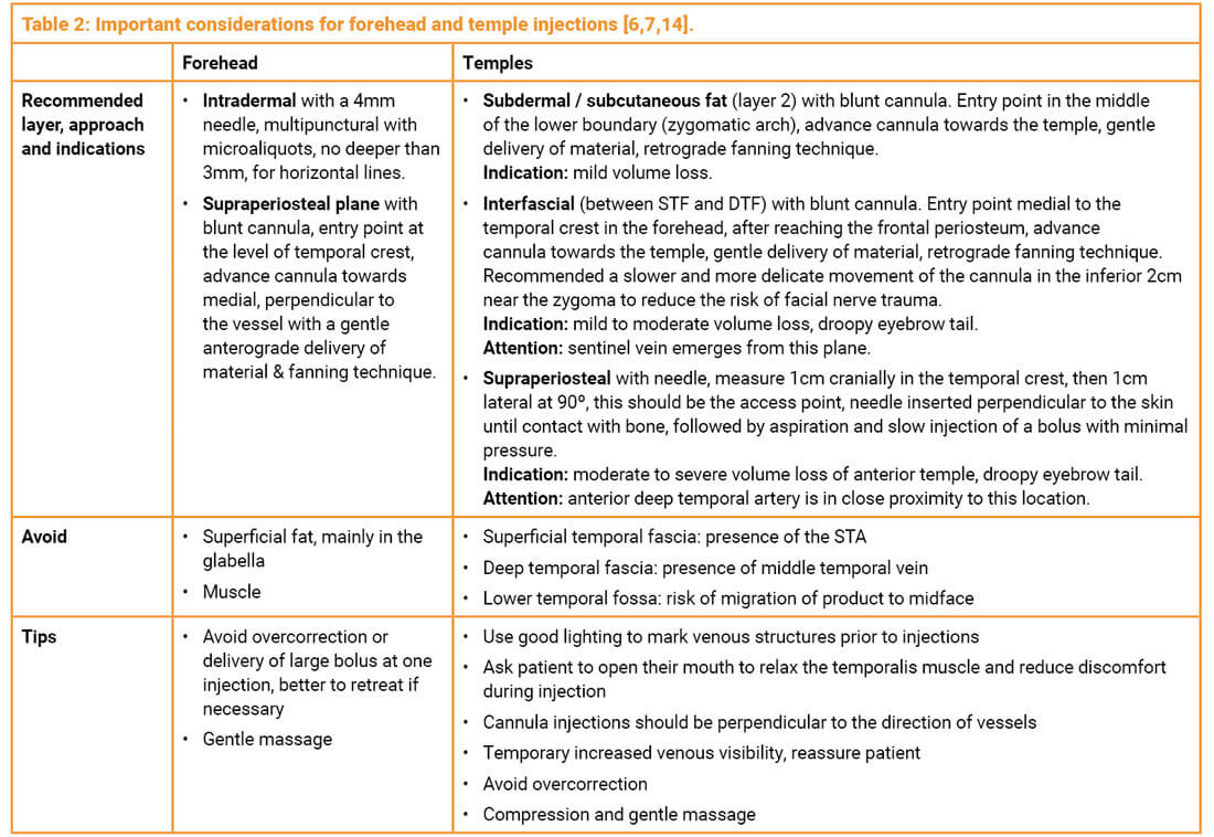 Recommended injection techniques for forehead and temples should be based on anatomical evidence found in the literature, respecting danger zones and ensuring the best outcome (Table 2).