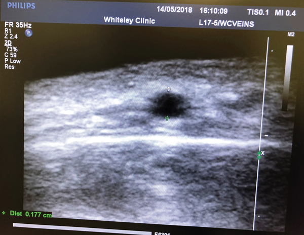 The scale shows that the vein is 0.177 cm in diameter and is about the same depth.