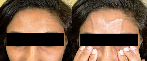 When veins are both big enough and deep enough, they can make the skin bulge above them, giving the appearance of a ‘varicose vein’. Of course a ‘varicose vein’ of the face is not really a varicose vein as we would understand it in the legs. In the legs, such varicose veins occur because the valves fail and blood accumulates in the vein due to gravity. In veins in the face, blood falls with gravity back towards the heart. However, these veins can still dilate, causing cosmetically unsightly bulges, particularly when certain provoking manoeuvres are performed such as smiling, talking, straining or leaning forwards. A new sign, never described to our knowledge before this article, is the ‘Whiteley-Smith provocation sign’ for forehead veins. In this new sign, subdermal veins of the forehead appeared after manual compression of the cheeks (Figure 4). This mimics the dilation of the same veins seen with the other provoking manoeuvres identified above. These veins tend to show no colour as they are deep to the dermis and the colour of the blood cannot be seen through such a thick layer of vein wall and skin.