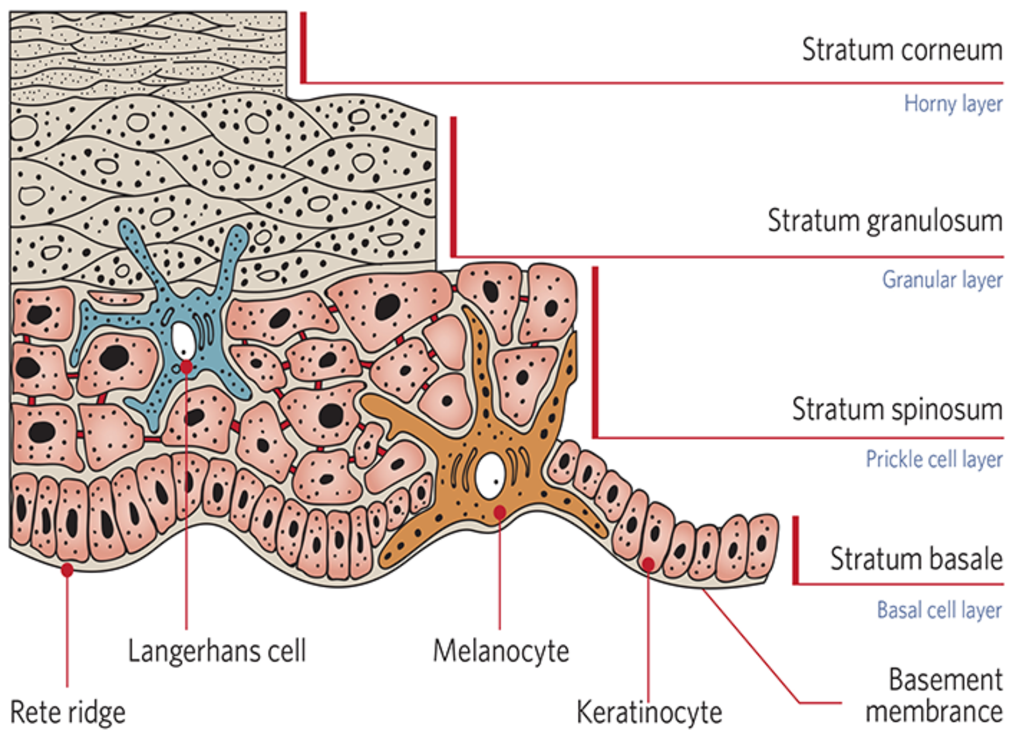 The stratum spinosum is the thickest layer of the epidermis with layers of polyhedral-shaped keratinocytes, which flatten as they approach the surface [1]. Langerhans cells are located in this layer and derived from monocytes of bone marrow [7]. They are morphologically and functionally similar to macrophages and have no role in keratinisation or pigmentation of the epidermis. Langerhans cells initiate an immune response against foreign antigens and are significant in allergic responses and other cell-mediated skin reactions [7]. The stratum granulosum comprises large, flattened polygonal granulated cells which still have nuclei and undergo final cell differentiation of the uppermost keratinocytes of the stratum spinosum. The stratum corneum is made up of flattened and highly keratinised cells lined with keratins, which are shed from the epidermis as dead skin cells [1].