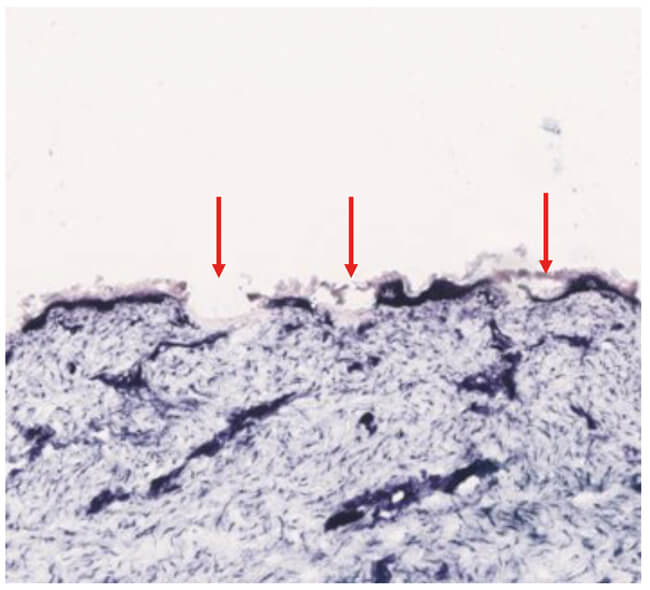 Figure 2: Nitro-blue-tetrazolium chloride (NBTC) staining of ex-vivo human skin treated with a fractional ablative 10,600-nm carbon dioxide laser demonstrates microscopic thermal zones of injury (red arrows) with vaporisation of the epidermis and dermis and coagulation of dermal tissue.