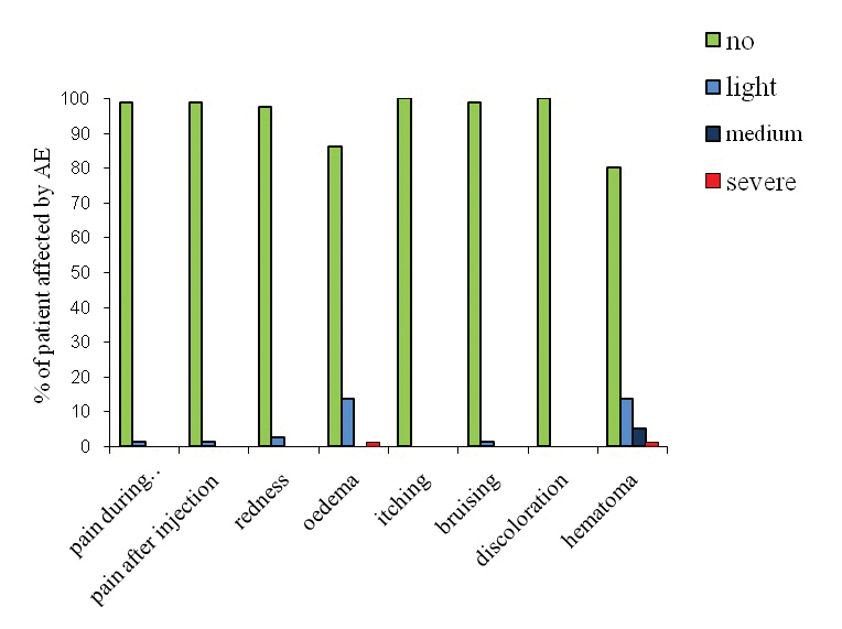 A total of 36 adverse events (AE) were reported by 30 out of 80 patients (37.5%), among which haematoma occurred in 16 cases (20%) and oedema in 12 cases (15%). Light redness affected two patients (2.5%) and there was one case of bruising and pain during or after the procedure (Figure 1). There was no itching or any other type of AE reported. All AE settled within 24 hours after the procedure. Seventy-two out of 80 patients gave their feedback noted by the doctors seven days after the procedure, 16 regarded the immediate outcome as excellent, 42 regarded the outcome as good and 14 as satisfactory.