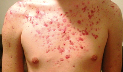 The patient was a 16-year-old male that presented with papules, comedones, painful nodules and cysts on the face, and a painful, ulcerating, and haemorrhagic clinical form of acne on the chest and back, as well as painful hip and knee joints. He was resistant to the usual acne antibiotics, but had tried topical non-prescription measures against acne, but no retinoids because of allergy to peanut oil. The patient didn’t have a meticulous skincare routine. His family refused the suggested combination of corticosteroids and isotretinoin.