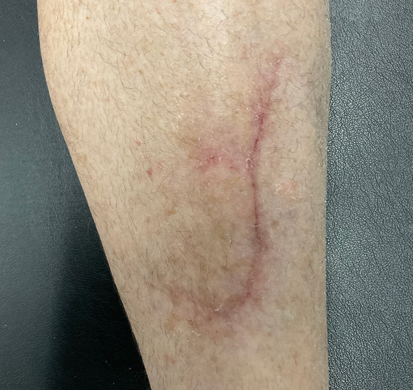 The chronology of the healing wound is shown in Figures 4-7. The wound had fully healed within 35 days and he was discharged. Seven months later the patient presented in clinic for unrelated neck physiotherapy and wished to share his comments: “The skin at the site of leg injury is smooth and soft with no evidence of a scar other than what now looks like a fine line tattoo on my foreleg, with no discomfort to touch.”