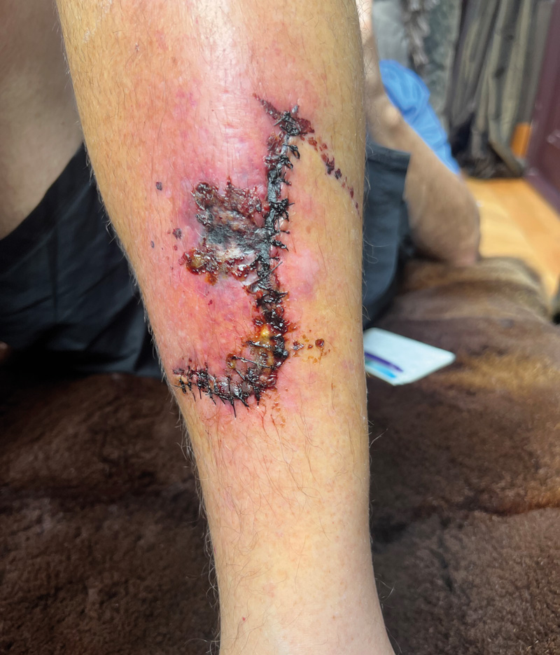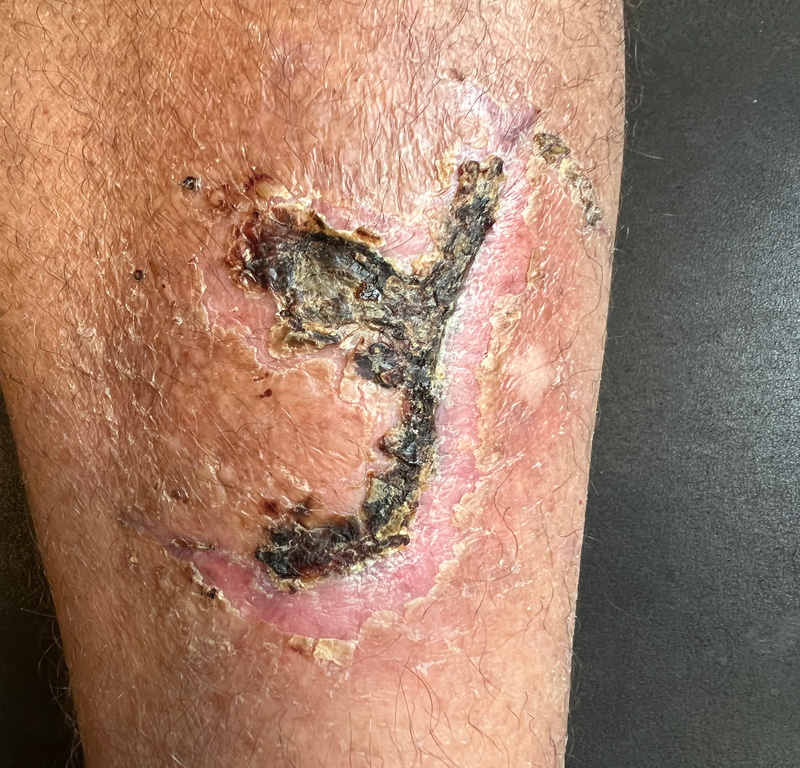 The patient is a fit and healthy, non-smoking, non-diabetic 62-year-old man with no significant medical history. On 4 October 2024 he fell through a hatch in the floor of his luxury yacht whilst sailing off the coast of Ibiza, Spain. He was airlifted to hospital on the mainland with an extensive pretibial crush type soft tissue flap injury on his left lower leg, which was debrided and primarily closed. He was given antibiotics for 10 days and discharged.
