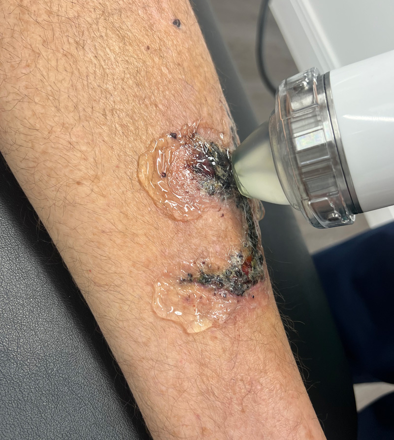 On 8 October 2024, four days after injury, he presented to the first author at his London Practice and the wound is shown in Figure 1. There is extensive full-thickness necrosis of the central wound area and an infected necrotic suture line with advancing cellulitis. The wound was cleaned, and he was given antibiotics. The sutures were removed at two weeks. At this first presentation, a course of fESWT (Stortz R) commenced (Figure 2 and 3). Treatment was topically delivered twice weekly using the handheld device with sterile contact gel as lubricant. The gel was applied directly over the healing area at settings of 0.02-0.03mJ/mm2 equating to 1500 shocks at 4Hz. He was encouraged to mobilise on crutches for two weeks and was thereafter full weight bearing and walking distances twice daily with a tubigrip support over a wound covering of non-adherent dressing. Between times he would elevate the leg at home. After eight weeks he was back in the gym training, adhering to a unique lower limb rehabilitation programme developed by the first author. He was also given advice on sun exposure months. He dispensed with his support tubigrip after six weeks.