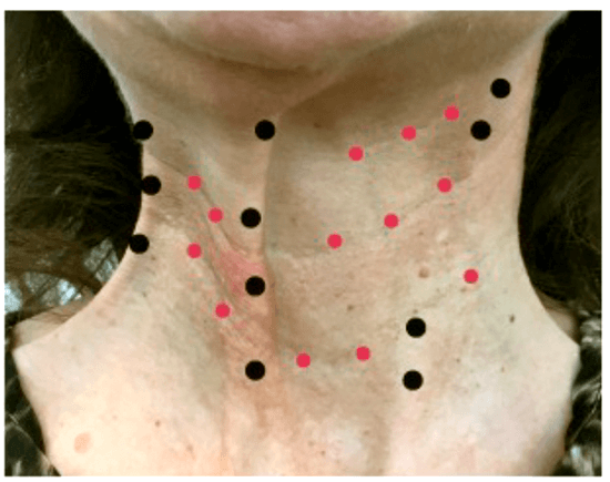 Botulinum toxin type A was then injected to treat the platysmal bands and horizontal lines using the following protocol: on the platysmal bands (in black) 2U per point was injected every 1-2cm in a relaxed state with a subdermal bolus technique. On the horizontal wrinkles (in red) 1-2U per point was injected every 1-2cm using an intradermal bolus technique (Figure 2).