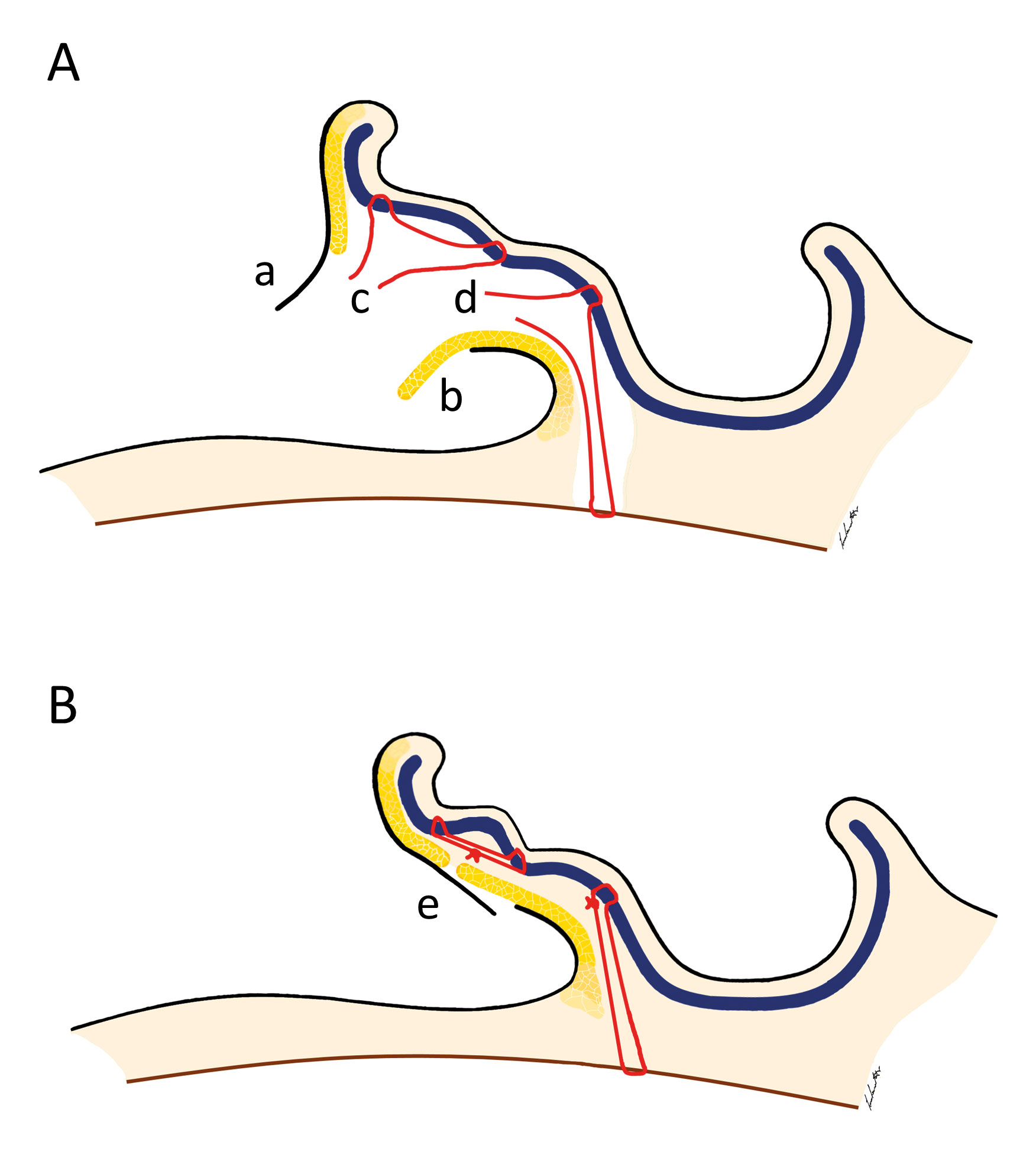 Figure 1: A. Dissection planes showing Horlock and Gault’s dermoepidermal (a) and fascial (b) flaps, and non-absorbable horizontal mattress sutures positioned to achieve antehelical folding (c) and conchal rotation (d). B. Suturing with Horlock and Gault’s flaps closed in double-breasted fashion (e).
