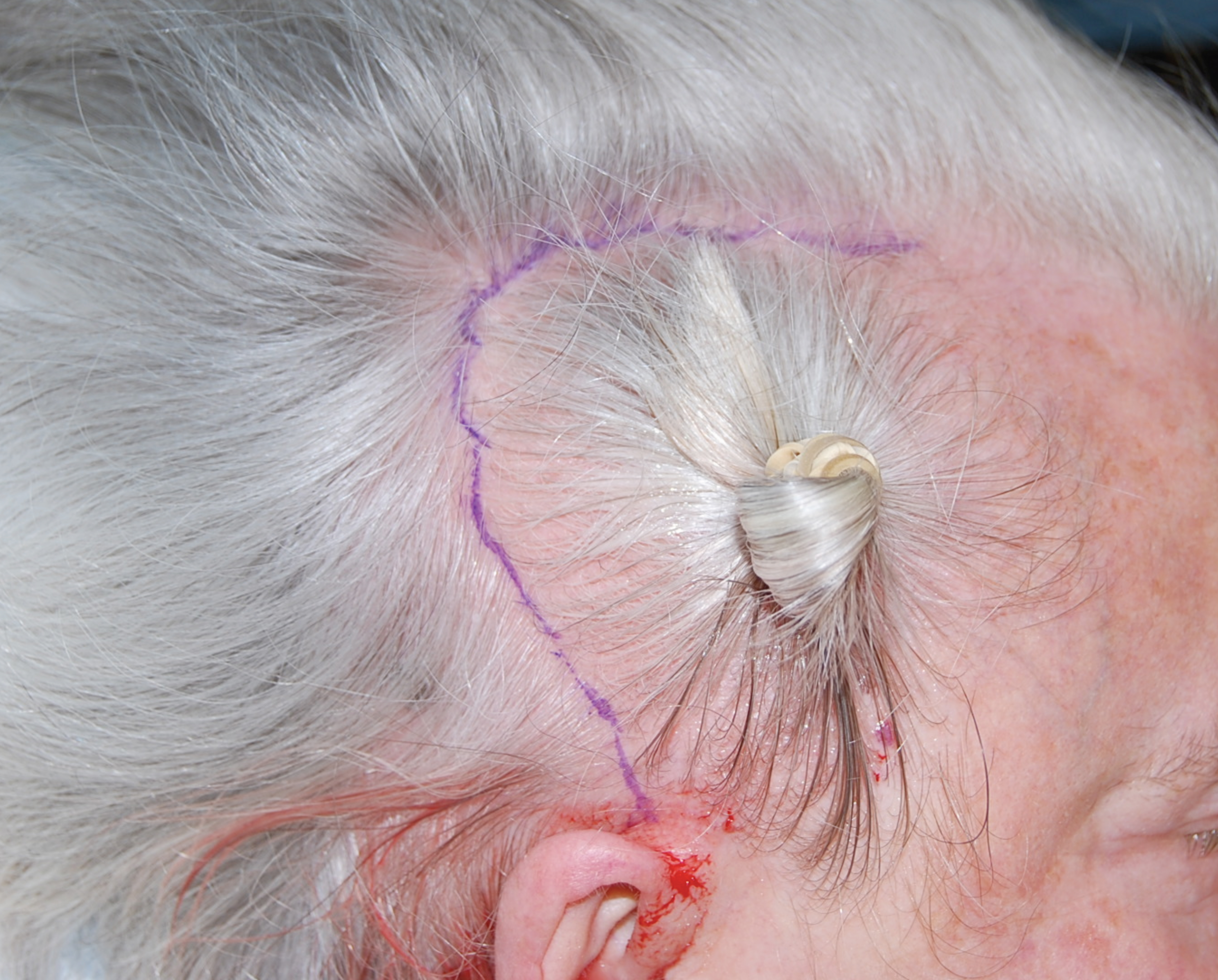 - A ‘question mark’ shaped incision is made in the temporal scalp on the paralysed side (Figure 1).