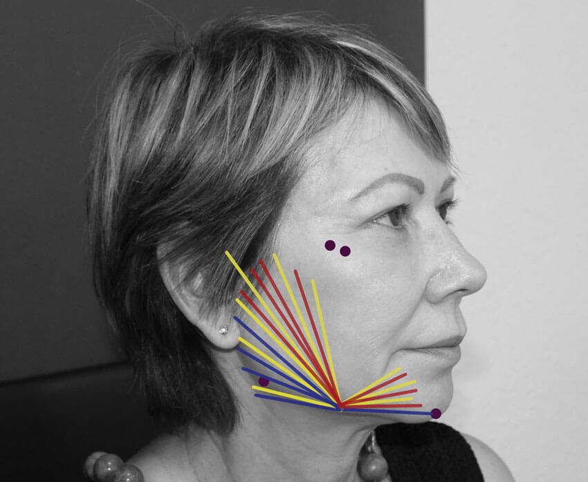 Step 2: Using a 22G, 7mm cannula 1ml of 0.5% procaine solution was infiltrated on each side of the face, following the yellow lines in the drawing. This helped to reduce the discomfort of the treatment of the fibrosis.