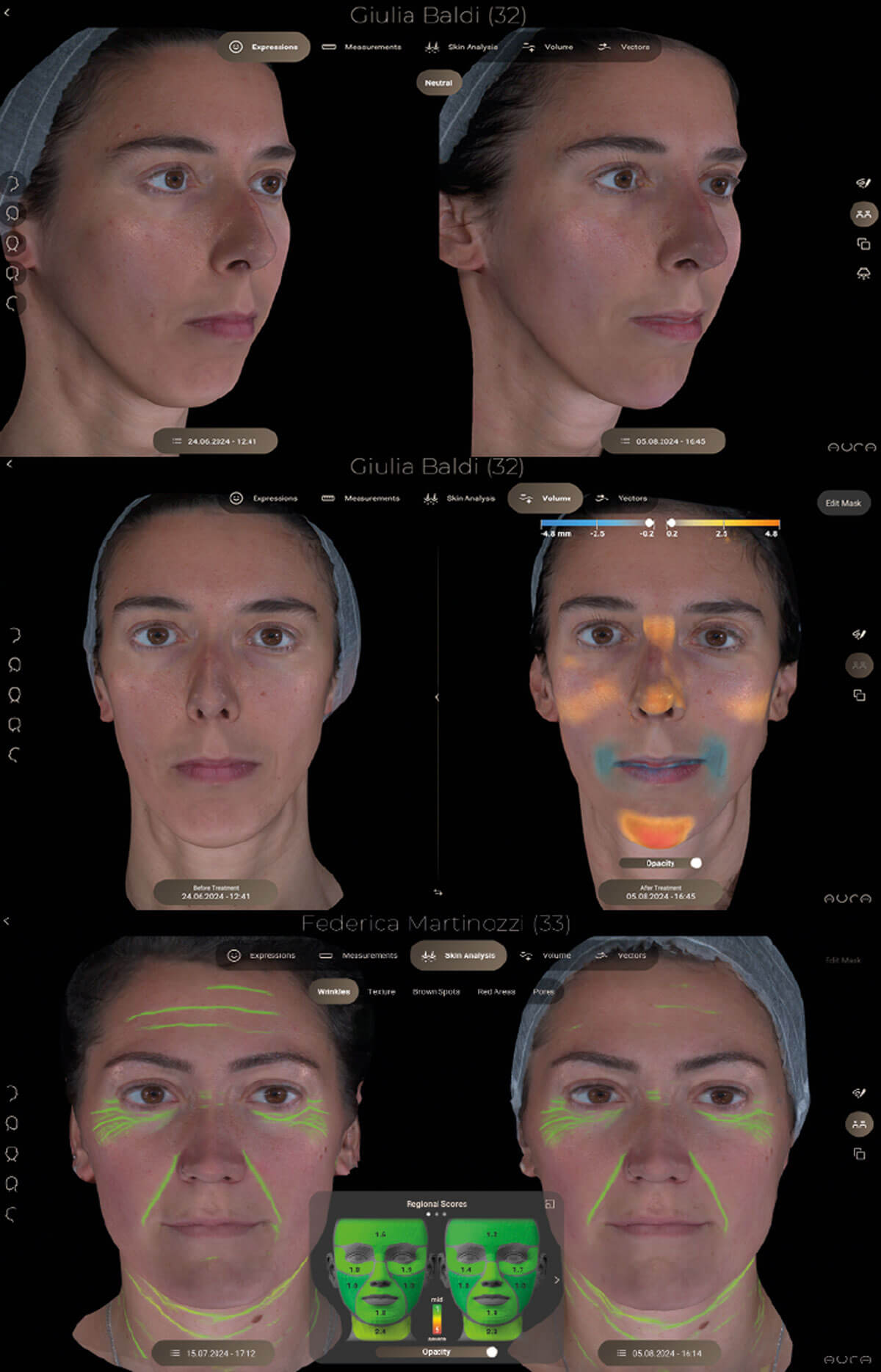 The latest available 3D imaging technology is called AURA. Compared to other equipment on the market that can capture a static image of the patient, this technology can capture up to five different emotions in the same session: neutral, angry, surprised (useful for an objective evaluation of the results with botulinum toxin), smiling (useful for both botulinum toxin and dermal fillers) and kissing (fundamental for evaluating the pre and post treatment of lip fillers).