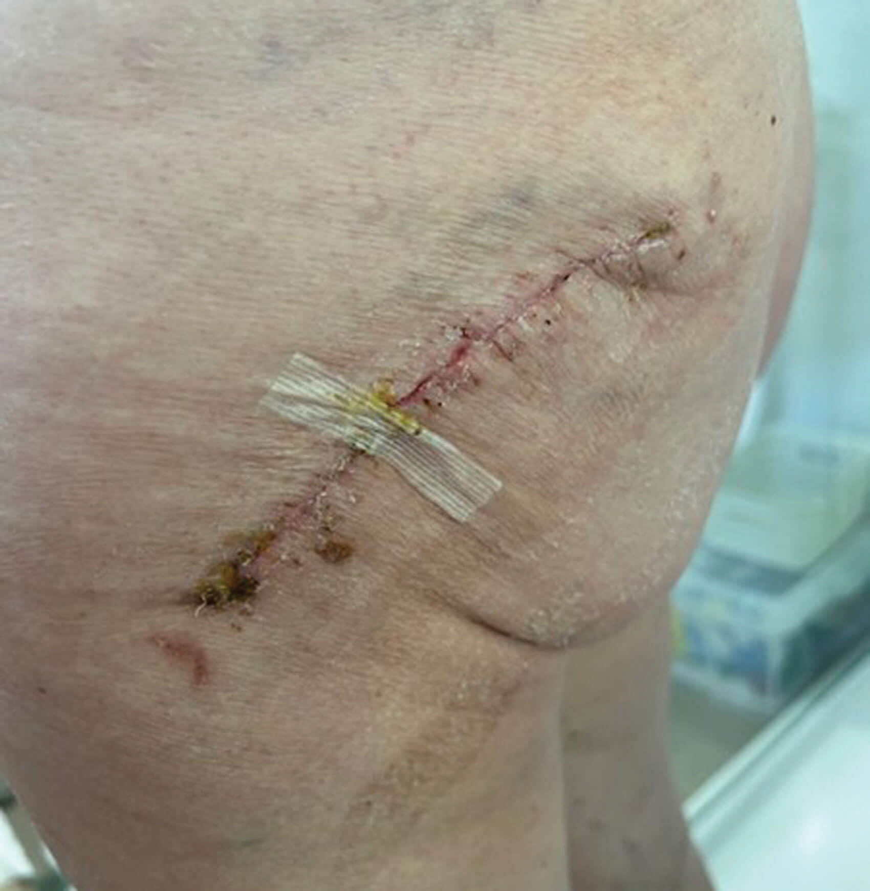 Figure 1: A 17-year-old male with a closed surgical incision used for access to biopsy of femur. The knots at each end are inflamed and buried with underling necrosis and there is iatrogenic necrosis of the skin closure at a site that has been placed under undue tension. The wound is obliquely placed across natural skin crease lines.