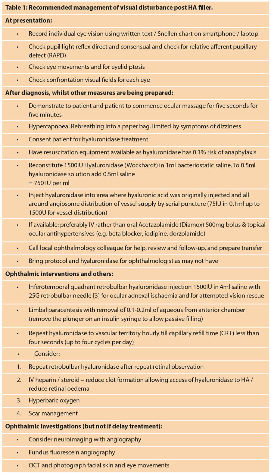 Hyaluronidase has proven helpful in resolving vascular obstruction by HA filler in cutaneous angiosomes. However, skin can remain viable for extended periods of ischaemia and affected areas can be readily identified by the mottled appearance and injected under direct visualisation; for visual disturbance the situation is more complex.