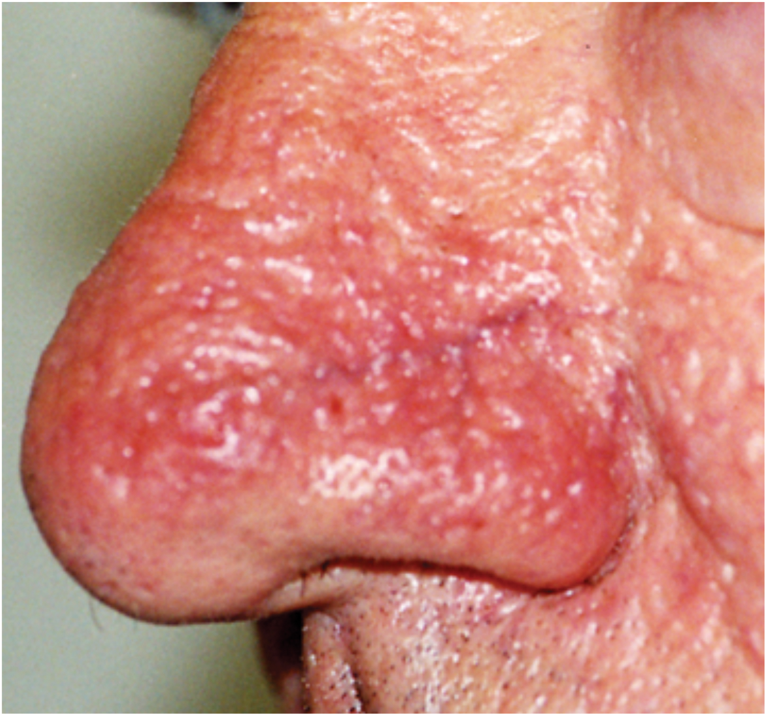 Rhinophyma is a slowly progressive, disfiguring disorder of the nose which represents the end stage of acne rosacea. The cosmetic deformity is often the reason for patients to seek medical attention. Ablative lasers can be used for incisional surgery and have the advantage of non-contact with the skin, haemostasis, reduced postoperative pain and sealing of lymphatic channels.